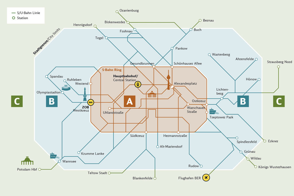 Travel pass: unlimited travel on the S-Bahn, U-Bahn, buses, trams and regional trains in zones A & B of Berlin for the duration of the program, plus an extension to the travel pass for any activities taking place in zone C.